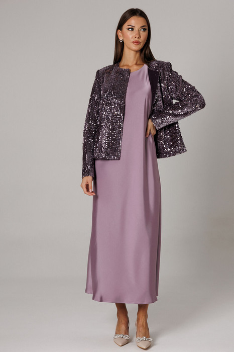 Жакет полуоблегающего силуэта с притачными рельефными бочками на спинке полочке из эффектной ткани с пайетками. Застежка фронтально вертикальная на скрытую кнопочную систему. Рукав втачной двухшовный. Длина жакета по спинке 54- 55 см, длина рукава 61-62 см. Горловина округлой формы.