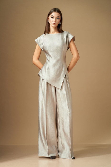 Брюки свободной формы с манжетами, слегка расширены книзу. Верхний срез оформлен цельнокроеным поясом. В боковых швах передних половинках расположены наклонные карманы. В брюках заутюжены стрелки. На передних половинках расположены складки, направленные к боковому шву, на задней правой половинке расположена «имитация» кармана в рамку с пуговицей, а так же талиевые вытачки. На передних половинках застежка на гульфик.