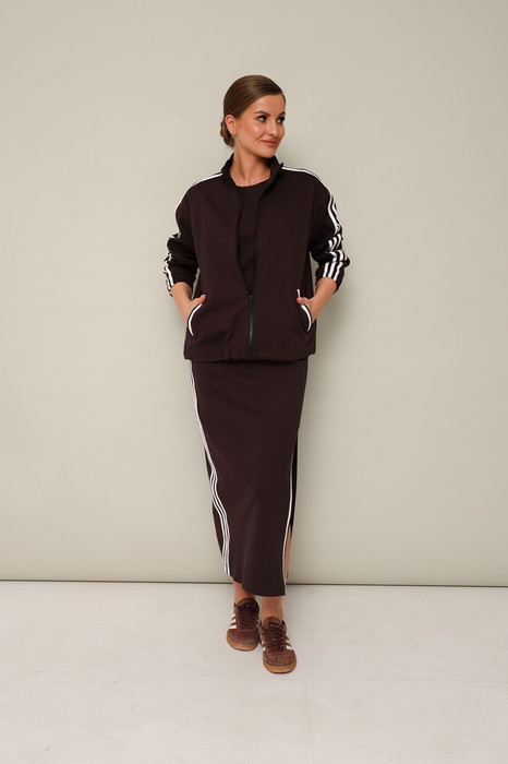 Платье полуприлегающего силуэта в длине миди. Округлый вырез горловины. В боковом шве обработан высокий разрез. По плечевому шву, рукавам, карманам бомбера и боковым швам платья настрочен декоративный элемент в виде хлопковой тесьмы контрастного цвета.
