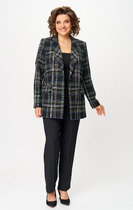 Комплект из костюмной ткани на подкладке, состоящий из жакета и брюк. Жакет приталенного силуэта с прорезными карманами с клапанами по переду. Воротник-английский, рукава - двухшовные. Застегивается на две кнопки. По жакету пришивная аппликация из черного кружева. Брюки прямого силуэта с наклонными карманами и поясом. Величина пояса регулируется резинкой. Застегиваются на молнию пуговицу по переду.