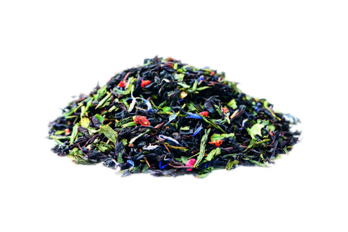 Купаж чёрного и зелёного чая с лепестками василька, листьями и кусочками клубники.