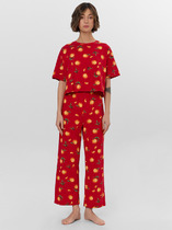 Пижама из тканой вискозы с принтом : белые крупные ракушки на голубом фоне.Рубашка с коротким рукавом, на пуговицах. Воротник отложной , английский крой. Брючки укороченные , широкого кроя, на резинке.