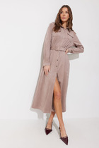 Платье на запах с воротником из плотного набивного трикотажа интерлок. Модель с длинными объемными рукавами. С помощью пояса можно регулировать посадку и силуэт.