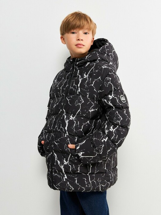 Утеплённая куртка с принтом для мальчика выполнена из ткани с водоотталкивающей пропиткой, которой не страшны мелкий дождь, туман и сырость. Куртка с тканой стежкой утеплена синтепухом (вес 250 гр/м2), что делает комфортным ношение при температуре от +5 до -15 градусов. Подкладка для тела и карманов выполнена из стандартной гладкой подкладочной ткани. Спереди расположена застёжка на молнию с защитой от защемления подбородка и внутренней ветрозащитной планкой. Практичности добавляют два кармана на молнии, в которых удобно хранить перчатки или греть руки. Рукава с трикотажными манжетами плотно прилегают к запястьям, предотвращая продувание. Куртка с несъемным капюшоном укроет ребенка от ветра и непогоды. На левом рукаве расположен декоративный силиконовый патч с надписями "FOLLOW YOUR POTENTIAL | URBAN CULTURE | CHOOSE ACOOLA" англ. - "Следуй за своим потенциалом | Уличная культура | Выбери "Акулу" . Куртку украшает стильный черно-белый принт, который делает образ более оригинальным и запоминающимся. Стильная и практичная, куртка для мальчика займет прочное место в гардеробе верхней одежды.
