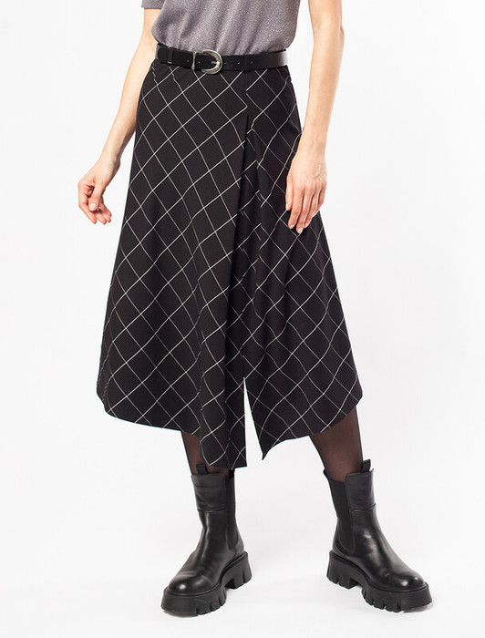 Юбка черного цвета в тонкую клетку кроеная по косой. Фокус внимания привлекает асимметрия, которая подчеркнута мягкой драпировкой. Для пошива модели использовали мягкую, эластичную ткань на основе вискозы с добавление полиэстера и нитей эластана. За счет чего, изделие не мнется и не сковывает движения. Сочетается с любой обувью.