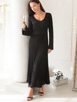 Платье А-силуэта выполнено из вискозы тонкой вязки с мягким люрексом. Модель с V- вырезом сидит по фигуре, подчеркивая женственные изгибы тела. Поперечная резинка на талии визуально делает талию уже, создавая эффект песочных часов. Юбка со складками в стиле "гофре" струится по бедрам. Изящный блеск пряжи позволяет носить изделие, как на торжественный выход, так и в повседневной жизни.
