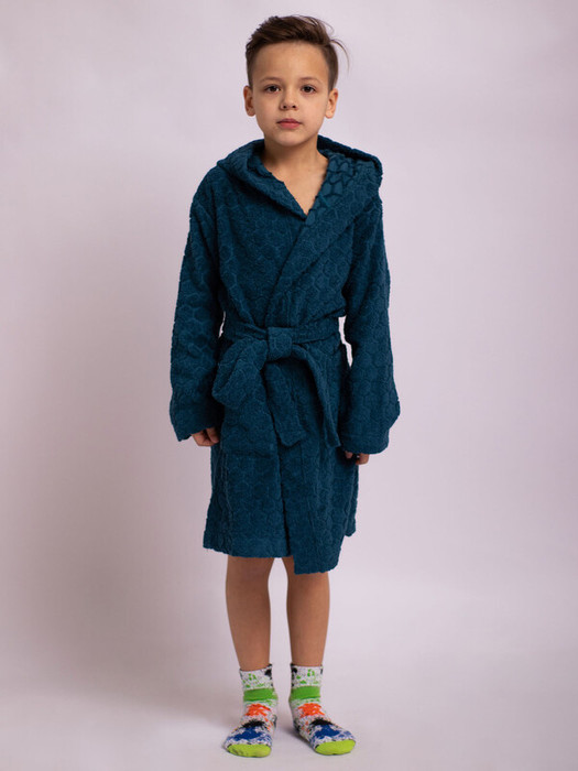 Халат фактурный для детей синий выполнен из 100% хлопка. С поясом и карманами. Двусторонняя махра, капюшон.