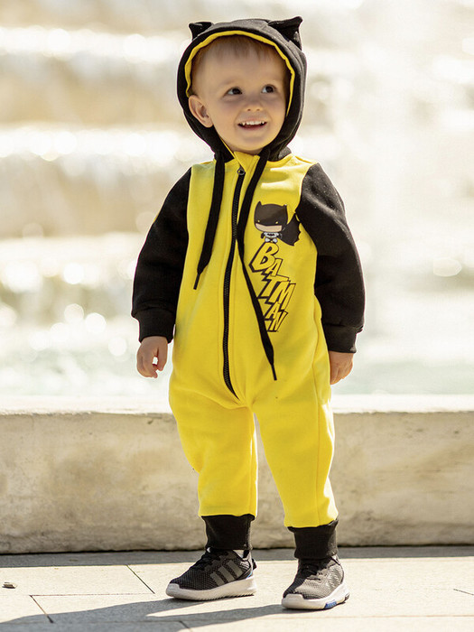 Комбинезон из футера детский Дэн черно-желтый. Капюшон с ушками, застежка на молнию, термотрансферы с Бэтменом.