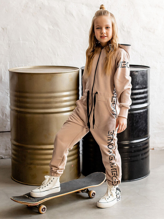Комбинезон Флай из футера детский на молнии. Комбинезон с капюшоном выполнен из плотного футера в бежевой расцветке для девочек и мальчиков. Манжеты рукавов и низ брючин на резинке. Есть карманы по бокам. Шнурок для утяжки по талии. Надписи по бокам и на рукавах.