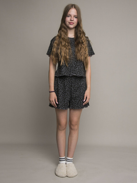 Пижамный комплект для девочки из кашкорсе: футболка + шорты. Модный черный комплект с эффектным леопардовым принтом, выполненный из мягкого кашкорсе (хлопок с небольшим добавлением эластана). Мягкая дышащая ткань с легкой растяжкой, удобная округлая горловина футболки, шорты с широкой эластичной резинкой на талии.Характеристики:Ткань: Кашкорсе 95% хлопок 5% эластанПроизводитель: batik
