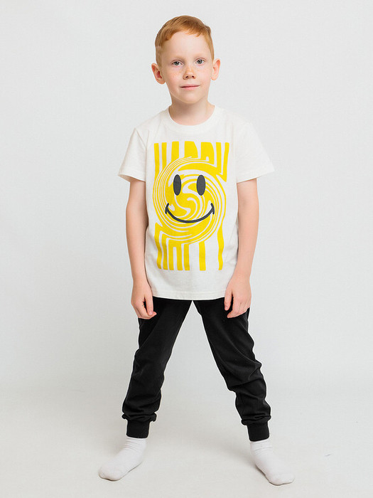 Комплект для мальчика трикотажный: футболка и брюки. Удобный костюм из супрема пенье подойдет для прогулок, занятий спортом и домашнего досуга. Футболка в молочном цвете с ярким принтом-смайликом, брюки однотонные черные спортивные.Характеристики:Ткань: Супрем пенье 100% хлопокПроизводитель: batik