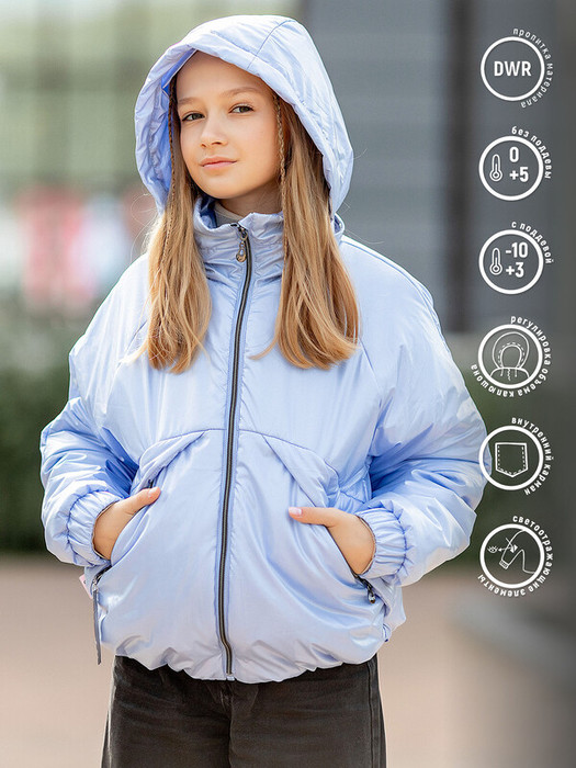 Куртка для девочки Ася в стиле спорт-шик с перламутровым эффектом в лавандовом цвете. Капюшон-трансформер сворачивается в воротник, а спереди прорезные карманы на молнии. Курточная ткань с водоотталкивающим покрытием DWR. На рукавах стеганые манжеты на резинке.
