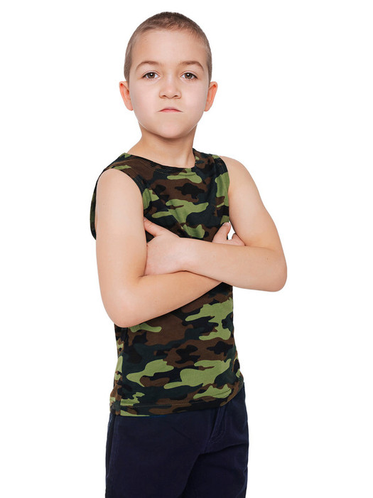 Майка детская милитари принт, натуральный хлопок. Размерный ряд для детей от 4 до 14-16 лет. Военная майка подойдет для праздников 23 февраля, 9 мая и другим. Также будет актуальна для повседневной носки.