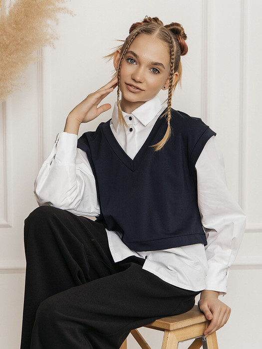Стильная рубашка-обманка для девочки. Эффектный топ с оригинальным дизайном, который создает иллюзию двух вещей - элегантной рубашки и уютного трикотажного жилета. Длинные рукава с аккуратными манжетами добавляют образу строгости и аккуратности. Визуальный эффект многослойности позволяет создать стильный лук без лишних слоев одежды. Идеально сочетается с юбками, брюками и шортами. Подходит для школы, праздников и повседневной носки.Характеристики:Ткань: хлопок 60%, полиэстер 40%Производитель: batik