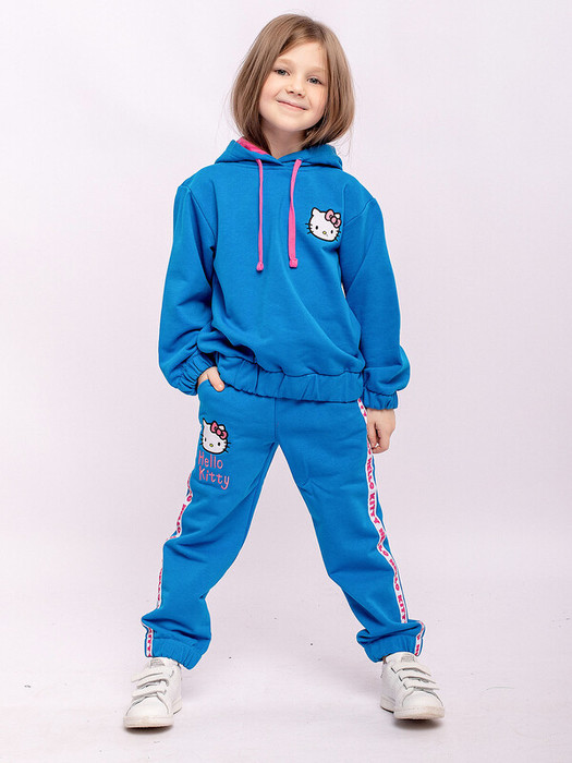 Спортивный костюм для девочки из футера. Коллекция Хелло Китти лицензия. Верх - толстовка с капюшоном и нашивкой на груди. Низ - брюки с боковыми лампасами и карманами. Манжеты рукавов и низ на резинке. Мягкий хлопковый трикотаж не сковывает движения, хорошо отводит влагу.