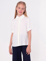 Блузка из кружева на трикотажной подкладке. Верхний край горловины выполнен с эластичной резинкой и сборками. Свободный крой, короткие рукава-реглан.На ребенке представлен размер 140:- Ширина изделия по линии груди 40,5 см- Ширина по низу изделия 47,5 см- Длина изделия 44,5 смРазница между размерами составляет 1,5 см.