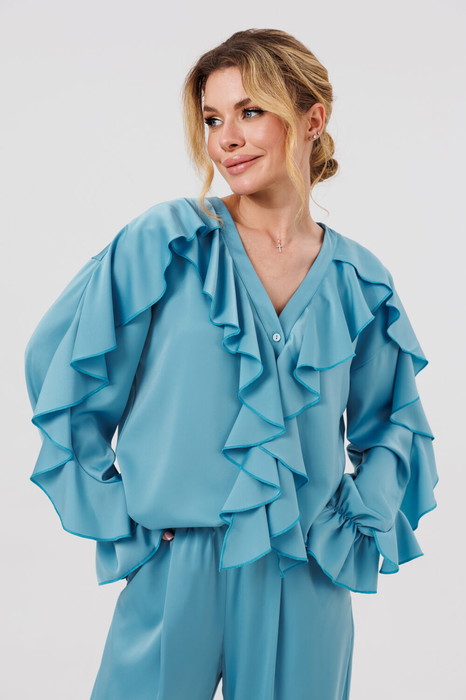 Блузка женская свободного силуэта с застежкой по переду на пуговицы. По переду блузки и по рукавам  декоративные воланы.