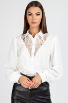 Блузка в горох с объемными рукавами на манжетах прекрасно впишется в любой гардероб. Изделие с планкой на пуговицах прекрасно сидит на фигуре, прямой крой вещи вытягивает силуэт, скрывает несовершенства и подчёркивает достоинства. Модель из крепа подойдет для носки в теплую погоду, зимой под жакет, жилет, кардиган, прекрасно сочетается не только с классическими брюками и юбками. Дизайнерская брошь ручной работы дополняет и украшает блузку.
