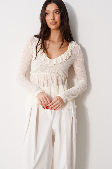 Джемпер полуприлегающего силуэта. Выполнена из трикотажного полотна. Характеристики: приталенный силуэт, без рукавов, вырез горловины круглый, глубокий по переду , по всей окружности притачана рюша, по талии джемпер разделен и присборен на резинке, низ обработан открытым срезом. Длина спинки 58 см
