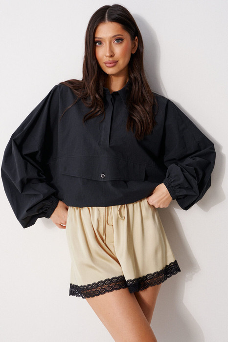 Блузон прямого свободного кроя выполнен из хлопковой ткани, в черном цвете. Характеристики: отложной воротник, застежка центральная на петли пуговицы, по переду имитация кармана. Низ изделия на резинке с фиксатором. Плечо спущено, рукав свободный, низ рукава на резинке. Длина по спинке 58 см, длина рукава от края горловины 83 см.