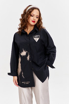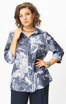 Блузка приталенного силуэта, выполнена из хлопковой белой ткани в черную и синюю полоску. Характеристики : Воротник отложной на стойке, рукав одношовный, втачной, по низу рукава притачная манжета. Застежка центральная на петли пуговицы. Верхняя часть спинки закрытая, длина 31см. Низ идет на завязках. Длина переда 67см, длина рукава от края горловины 77см.