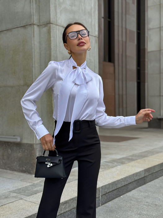 Блуза классическая, выполнена из синтетичского шелка. Рукав втачно ношовный, обработан манжетой из основной ткани. Лиф изделия обработан притачны бантом