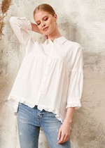 Блуза прямого силуэта с классическим воротником. Застёжка- планка с пуговицами. Плечевой шов спущен. Рукав обработан широкой манжетой, ширина манжеты регулируется шнурком из основном ткани. В комплекте есть деталь для фантазийного способа носки блузы, когда низ блузы перекрещивается внахлест и застегивается планкой, идущей в комлекте. Такой способ делает основной акцент на талии. Планка съёмнаяя. Носить блузу моно в класическом варианте.