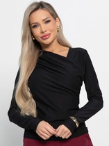 Блуза свободного кроя с отложным воротником на планке с застёжкой на петли – пуговицы контрастного цвета. Рукав со спущенной проймой на манжете. Спинка на кокетке со встречной складкой. Низ спинки имеет фигурную форму.
