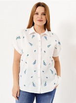 Блуза удлиненная из текстильной ткани, свободного силуэта. Застежка центральная на петли-пуговицы. Воротник отложной на стойке. По переду обработаны кокетки и вертикальные рельефы от нее. По левой полочке в области груди небольшой настрочной карман. Спинка с кокеткой. Рукава укороченные, втачные, с патой. Длина рукава 46 см, длина по спинке 86 см.