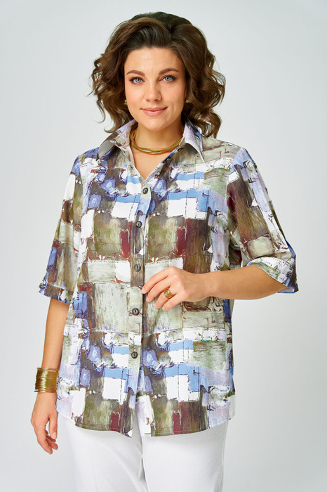 Блуза прямого кроя, рукав короткий, по рукаву застрочены вертикальные защипы, отложной воротник, центральная застежка на петли-пуговицы, нагрудная вытачка, спинка цельная, боковые разрезы, идеальная блуза на каждый день. Длина рукава 37,5,длина по спинке 72.