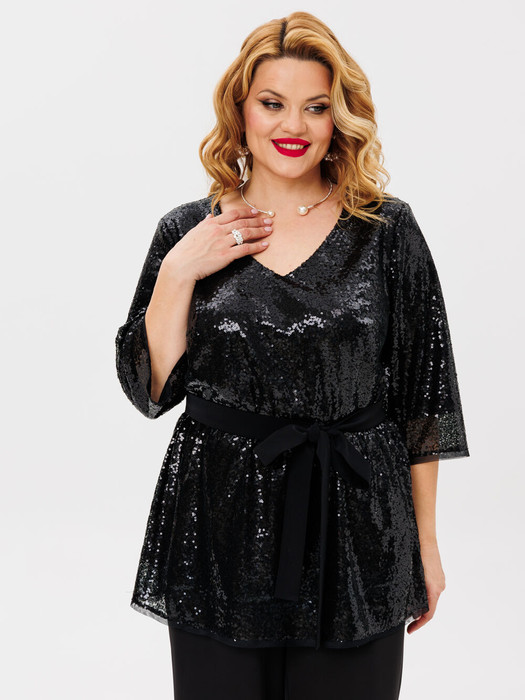 Блузка из пайеток на подкладке. Блузка свободного силуэта, с V-образным вырезом горловины, с нагрудными вытачками, лаконичная. Спинка лаконичная, с разрезом от горловины, с пуговицей. Рукава втрачные, длина 3/4. Для прилегания талии, в комплект входит пояс из однотонной ткани. Идеальный вариант для торжественных мероприятий, встреч с друзьями, выхода в театр.