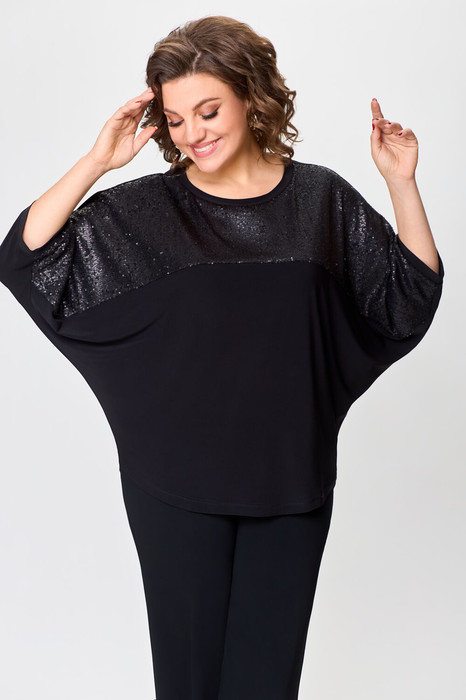 Блузка выполнена из тонкого трикотажного полотна в комбинации с отделочной тканью в пайетки.
