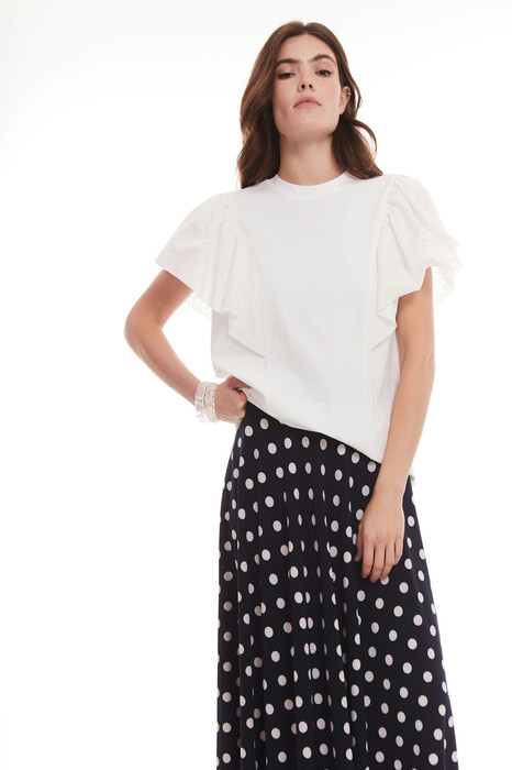 Блузка женская, прямого силуэта, без рукавов. В рельефах переда и спинки вставлены воланы  из х/б ткани с вышивкой.