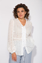 Форма блузки — свободная, прямого силуэта, без застёжки спереди, с лёгким скруглением по линии низа. Рукава — длинные, со сборкой по линии манжеты, создающей деликантный объём и лёгкий фонарик. Манжета фиксируется резинкой внутри, что делает посадку удобной и комфортной.