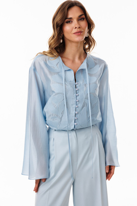 Блузка выполнена из полупрозрачной плательно-блузочной ткани. Блузка А-образного силуэта, длиной ниже линии бедер. По переду обработана центральная застежка встык на навесные петли и пуговицы. Спинка цельная. Горловина округлой формы с завязками по переду. Плечевой шов удлинен. Рукав рубашечного покроя, одношовный, расширенный к низу. В боковых швах обработаны разрезы. Блузка декорирована по переду вышивкой.