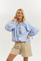 Блуза женская шикарная нарядно - повседневнаая полуприлегающего силуэта на подклдке, выполнена из красивого шифона с принтом. Вырез горловины воротник на стойке рубашечного типа, рукав втачной по низу с притачными воланми. Застежка доверху на обметанные петли и пуговицы, низ блузы фигурный (по спинке длиннее). По переду блузы притачные воланы, в боковых швах обработаны разрезы. Декором блузы служит принт амой ткани и отделочные элементы в виде воланов.