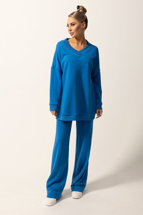 Блузон в стиле оверсайз, с V-образным вырезом горловины. По горловине- втачная планка. Плечо спущенное, рукав длинный. По низу блузона- притачной пояс.