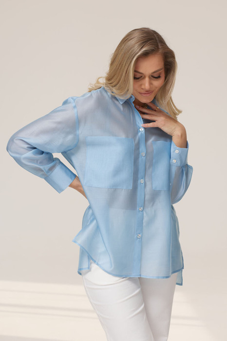 Блузка женская, прямая, с центральной застежкой на петли и пуговицы. По переду в области груди настрочены накладные карманы. Спинка с отрезной кокеткой, кокетка с центральной застежкой на петли и пуговицы. Нижняя часть спинки со складкой. Плечевой шов смещен на перед, линия плеча спущена. Рукав притачной, по низу обработан широкой манжетой, которая застегивается на петли и пуговицы. Горловина округлой формы, обработана воротниками (2) рубашечного типа с отрезной стойкой. По боковым швам отстрочены разрезы, перед короче спинки.