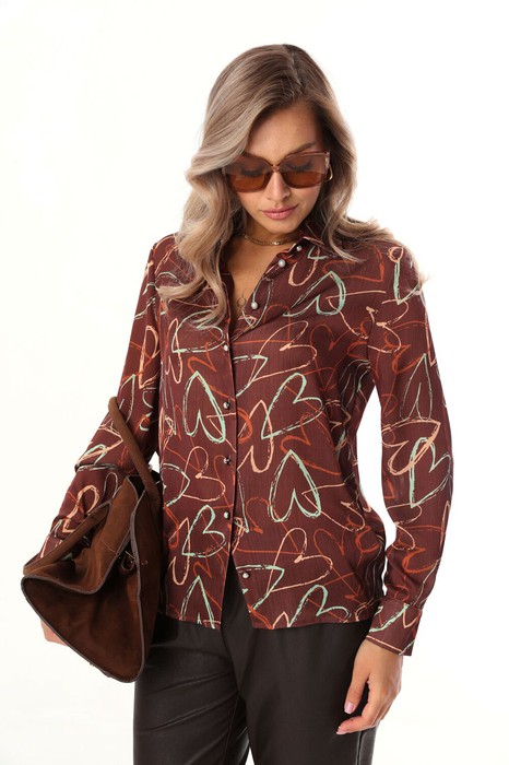 Блузка прямого силуэта с оригинальным принтом из лёгкой ткани с атласным мягким блеском. Воротник рубашечного типа, застежка на прорезные петли и пуговицы. В нижней части рукава заложены складки, манжета на двух пуговицах.