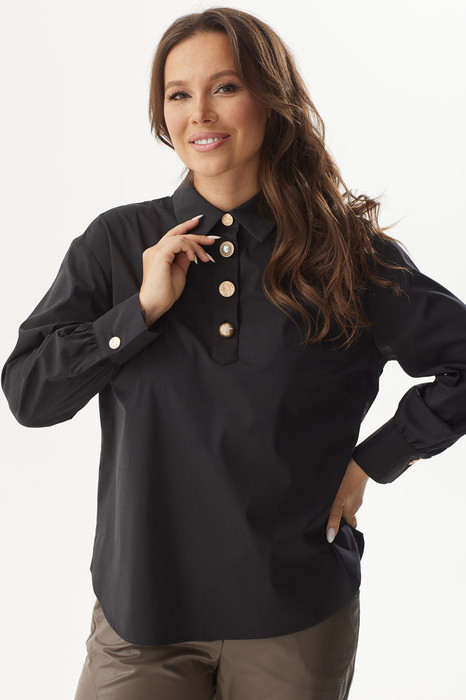 Стильная блуза свободного кроя. Выполнена из хлопковой ткани. Застежка спереди на пришивные пуговицы. Воротник отложной. Рукав втачной, дополнен притачной манжетой. Длина блузы от плечевого шва 68 см. Длина рукава 60 см.