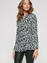 Блузка женская прямого силуэта на центральной застежке на петли и пуговицы. Перед с нагрудными вытачками от боковых швов. Спинка цельнокроеная. Рукав втачной одношовный длинный по низу со сборкой и на манжете, застегивающемся на петлю и пуговицу. Горловина на стойке с воротником.