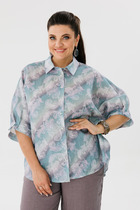 Блуза прямого силуэта. В боковых швах разрезы . Низ разноуровневый. По переду нагрудные вытачки и декоративная вышивка. Спинка со средним швом.Плечо немного спущено. Рукав рубашечного покроя , 3/4, слегка расширен к низу. Горловина "лодочка".