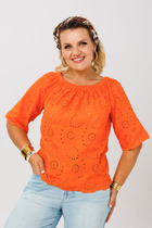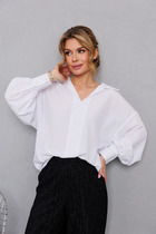 Блуза свободного силуэта. По переду планка с потайной застёжкой на семь прорезных петель и пуговиц. По спинке кокетка со сборкой. Рукава одно шовные втачные, на широкой манжете с двумя складками. Воротник отложной на стойке. Боковые швы блузы заканчиваются небольшими разрезами