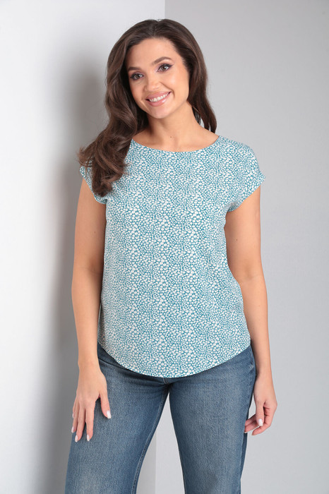 Блуза женская  свободного силуэта со спущенной линией плеча и коротким рукавом. Перед блузы цельнокроеный  с нагрудной вытачкой. Спинка с застежкой по центру до низа на декоративные пуговицы. Горловина округлой формы. По боковым швам внизу разрезы. По краю проймы рукава притачана отложная манжета.