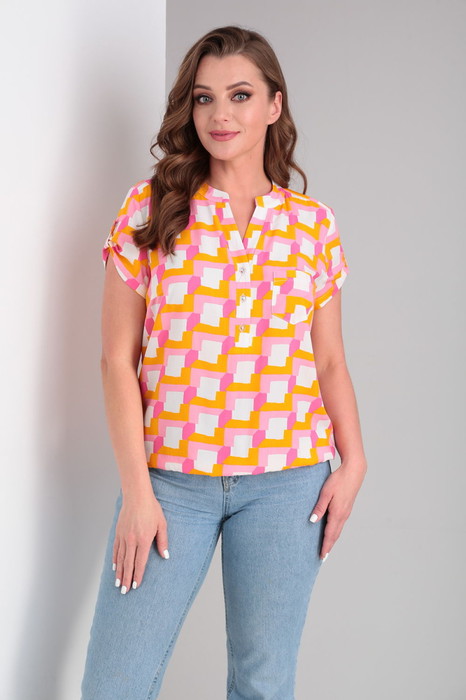 Женская блузка свободного силуэта с втачным рукавом из  хлопок содержащей ткани. По переду  изделия  нагрудные вытачки и центральная  планка, застегивающаяся на пуговицы. На левой  полочке накладной карман. Спинка с кокеткой переходящей на полочку. По центру спинки сборка. Рукав короткий, прямой, втачной с патой на застежку. По горловине плоско лежащий воротник-стойка. Низ блузки на резинке.