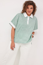 Блузка женская c рубашечным воротником, свободного силуэта. Полочка и спинка изделия, горизонтально разрезные на косую. Верхняя часть полочки с нагрудными вытачками, накладным карманом на левой части и цельнокроеной планкой на застежку. Рукав прямой, втачной с широкой манжетой на отворот. Низ изделия фигурный с разрезами по боковым швам, обработан широкой обтачкой.