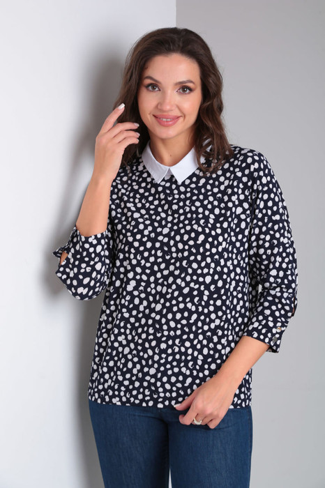 Блузка свободного кроя с цельнокроеным рукавом, воротник со стойкой. Рукав длинной ниже локтя с широкой манжетой на застежку петли - пуговицы. Спинка блузки стачная по среднему шву с обработанным разрезом на застежку пуговицу. Низ собран на эластичную ленту.