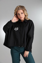 Блуза прямого свободного кроя с округлым вырезом горловины с декоративной нашивкой. По переду две отлетные складки в рельефе. Рукава втачные длиной три четверти. По низу изделия притачной волан из трикотажного гофре.
