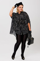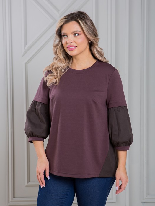Оригинальная блузка свободного силуэта, выполнена в сочетании трикотажного и хлопкового полотен. Перед блузки целый с двумя нагрудными вытачками. Спинка с отрезной кокеткой и глубокой встречной складкой по шву притачивания кокетки. Блузка с фигурными боковыми швами, переходящими на перед. Горловина переда и спинки с узкой притачной планкой. Блузка со свободной заниженной проймой. Рукав втачной, длиной 3/4, из двух частей. Нижняя часть рукава в форме баллон с узким притачным манжетом по низу. Длина рукава от плеча в 52 р-ре – 45 см. в 64 р-ре – 47 см, ширина рукава по низу в 52 р-ре – 29 см. в 64 р-ре – 32 см. Низ блузки фигурный, разно-уровневый, спинка длиннее переда на 10 см. Блузка без застежек и подклада. Длина изделия по спинке в 52 р-ре – 78 см. в 64 р-ре – 85 см.