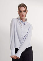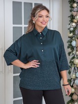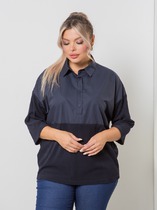 Удобная повседневная блузка свободного силуэта, выполнена в сочетании 2-х видов ткани. Блузка с отрезным низом по переду и спинке. Верхняя часть переда с центральной застежкой на петли и пуговицы. Спинка со средним швом. Нижняя часть переда и спинки целая. По горловине втачной отложной воротник на цельнокроеной стойке. Блузка с удлиненной линией плеча и свободной заниженной проймой. Рукав втачной, длиной 3/4. Длина рукава от горловины в 50 р-ре – 53 см. в 64 р-ре – 60 см., ширина рукава по низу в 50 р-ре – 30 см. в 64 р-ре – 36 см.В В Нижняя часть блузки и рукава выполнены из трикотажного полотна лапша. Верхняя часть блузки из ткани-компаньона. Блузка без подклада. Длина изделия по спинке в 50 р-ре – 68 см. в 64 р-ре – 76 см.